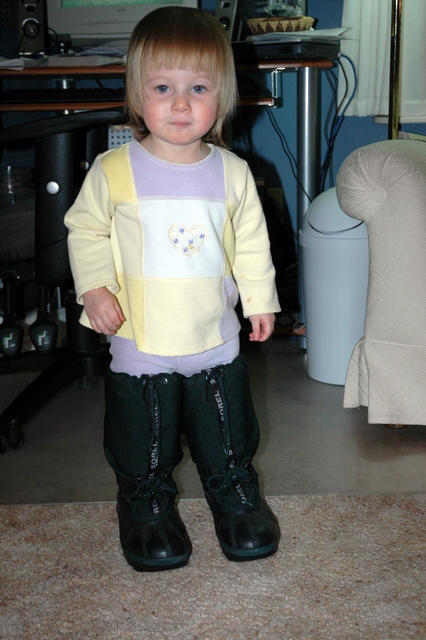 Boots Posted on December 13, 2006 by Troy Ellie likes wearing our footwear, especially her mom’s as they are smaller and lighter. The other day, however, she wanted to put on her mom’s winter boots, which became hip waders on Ellie. She was only able to take one step before she fell over..