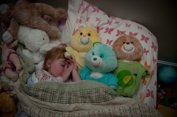 Sometimes in the night there is a little gremlin that sneaks out of her bed and rummages about for clothes for herself or her friends. It isn’t uncommon to find her with four layers of clothes on in the morning. The other night she sought out clothes for three vintage Care Bears (I say vintage because they are probably 20+ years old, donated to the gremlin’s collection by Auntie Alana).