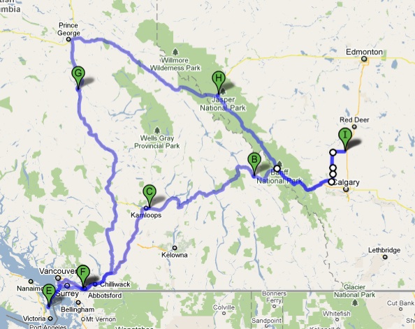 Olds, Alberta to Golden, to Kamloops, to Abbotsford, to Vancouver Island, to Abbotsford, to Quesnel, to Jasper to…  HOME.