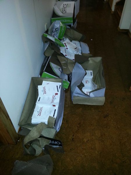 • The house where all the books for this coming weekend were stored had a water leak right over top of the boxes of materials, destroying a good percentage of them. Thankfully, we’ve been able to get the materials replaced, though the damage to the basement has been distraction and concern.